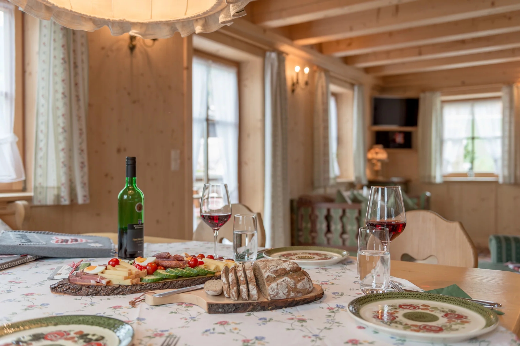 Die handbemalten Bauernmöbel in kräftigen Tiroler Farben verleihen dem Raum eine authentische Atmosphäre.